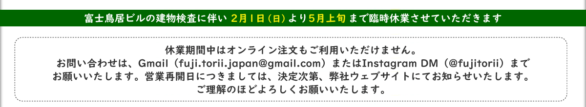 株式会社富士鳥居は、生業の古美術ばかりでなく、創業100年の知識と経験を活かし、現代の画家・工芸家と共に真面目な美術品・工芸品の企画・制作をし、作家・産地との直接取引によって真面目な価格にて販売いたしております。
